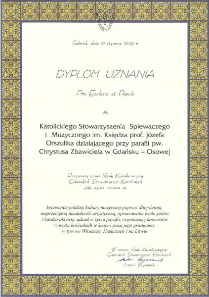 - koncert kolęd w Dworze Artusa z okazji opłatka dla katolickich organizacji pozarządowych organizowany przez Radę Koordynacyjną Gdańskich Katolickich Stowarzyszeń , pod egidą Arcybiskupa Gdańskiego i Marszałka Woj. Pomorskiego, podczas którego wyróżniono nasz chór elitarnym dyplomem PRO ECCLESIA ET POPULO,